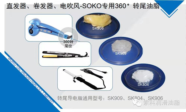 索科SOKO轉尾油脂專為直發器/卷發器360度無死角長效應用,有效減少磨損,對塑膠及貴金屬無化學反應,索科SOKO專用轉尾油脂SK909 和SK908系列/電源線轉動部位接點潤滑油廣泛應用于各大國際知名品牌廠的直發器、自動卷發神器中。