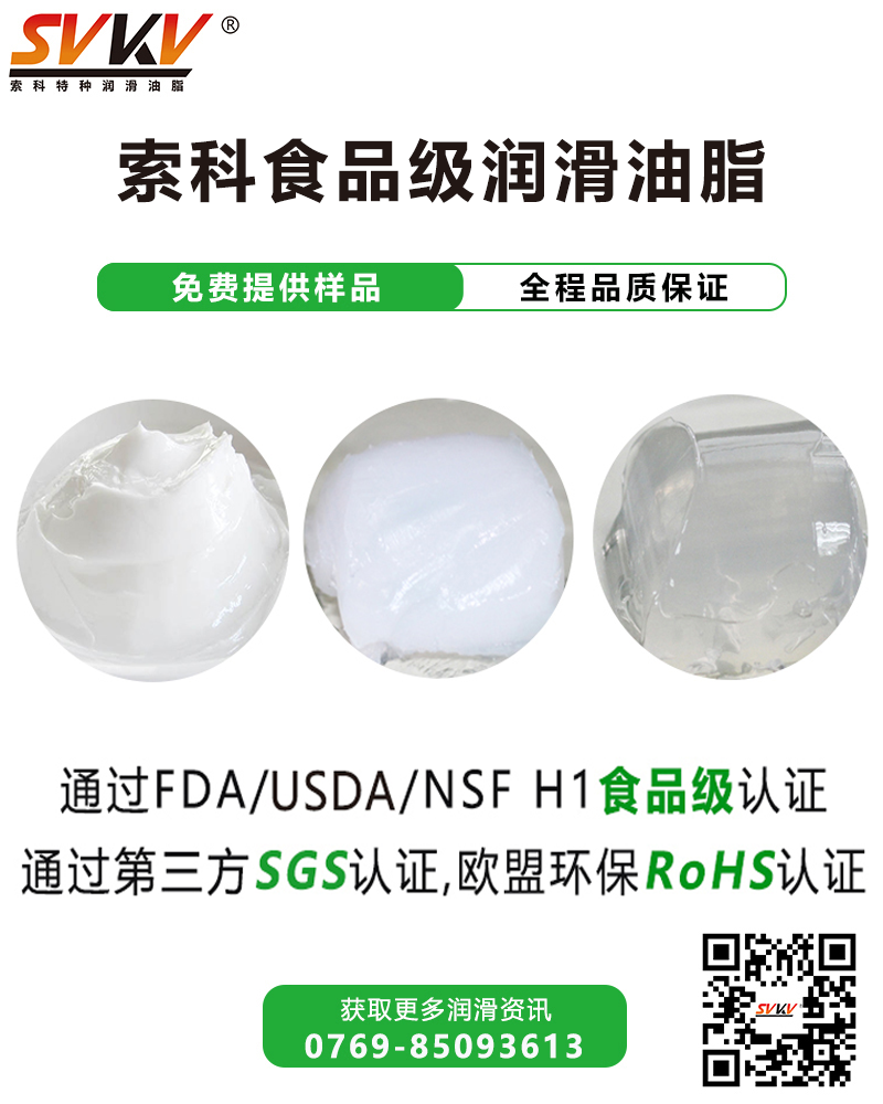 索科SVKV系列食品級(jí)潤滑油脂符合美國FDA和USDA的法規(guī)標(biāo)準(zhǔn),并通過NSF H-1食品級(jí)認(rèn)證,保障食品安全。