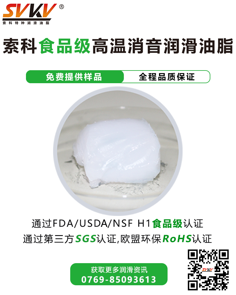 索科SVKV食品級(jí)高溫消音潤滑油脂選用食品級(jí)的基礎(chǔ)油和無毒無害的添加劑精制而成,專為食品加工和醫(yī)療設(shè)備而研制。索科SVKV食品級(jí)高溫消音潤滑油脂符合美國FDA和USDA法規(guī)和標(biāo)準(zhǔn),并通過美國NSF H-1食品級(jí)認(rèn)證,保障烤箱食品安全健康。